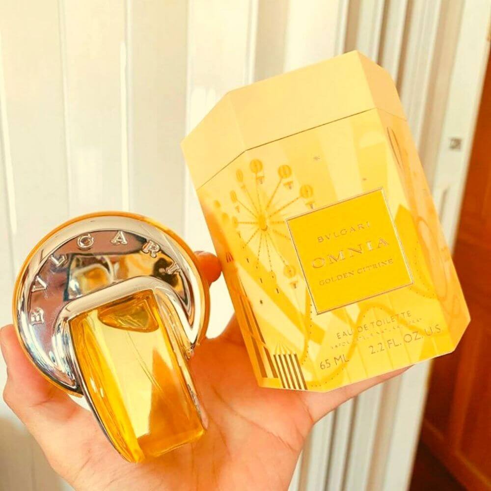 Bvlgari Omnia Citrine for Women's top notes are White Peach and Sicilian Mandarin; middle notes are Ylang-Ylang and Jasmine; base notes are Benzoin and Cedar.