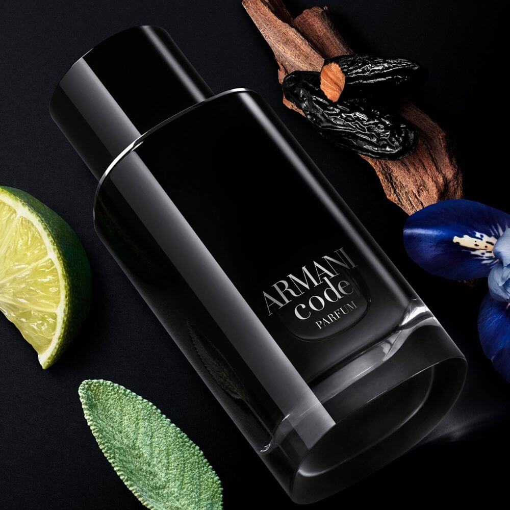 Giorgio Armani Code Parfum For Men's top notes are Bergamot and Bergamot Leaf; middle notes are Iris, Clary Sage, Aldehydes, and Orris; base notes are Tonka Bean and Cedar.