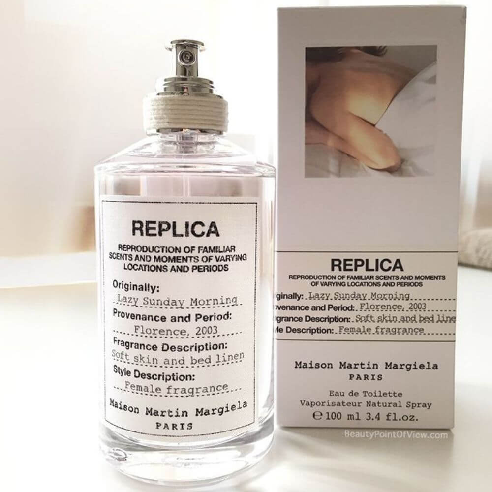 Maison Margiela’s Replica Lazy Sunday Morning's top notes are Aldehydes, Lily-of-the-Valley, and Pear; middle notes are Rose, iris, and Orange Blossom; base notes are White Musk, Ambrette (Musk Mallow), and Indonesian Patchouli Leaf.