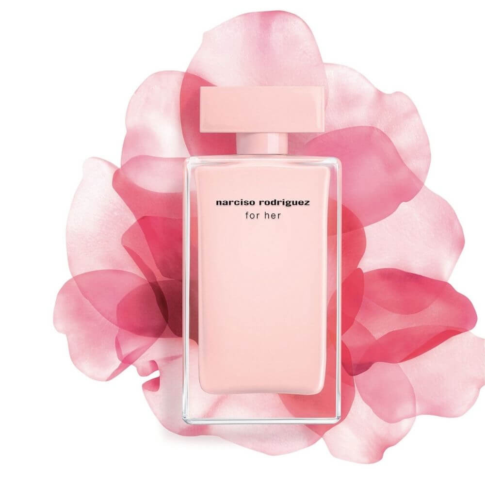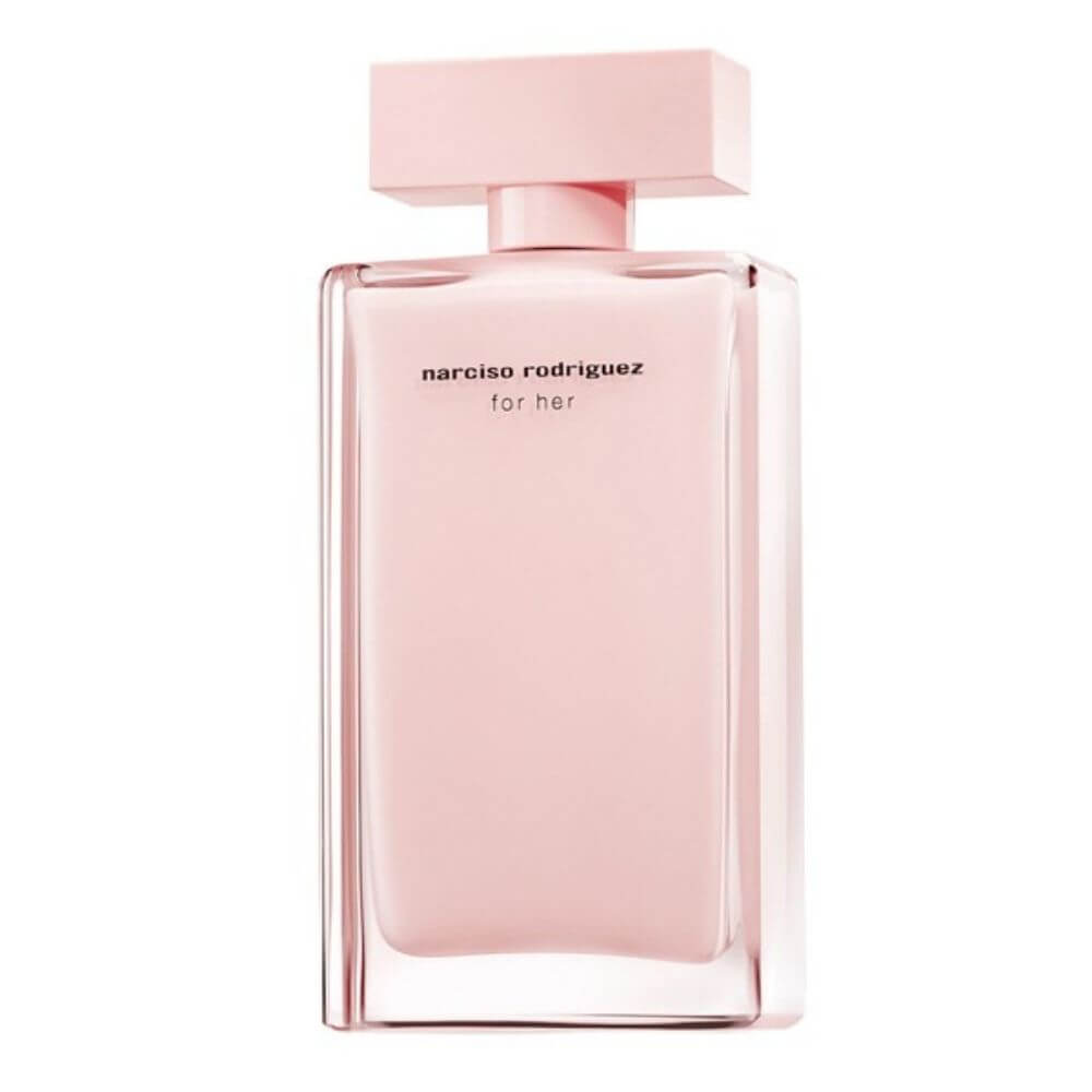 Narciso Rodriguez For Her Eau de Parfum's top notes are rose and peach; middle notes are Musk and Amber; base notes are Patchouli and Sandalwood.