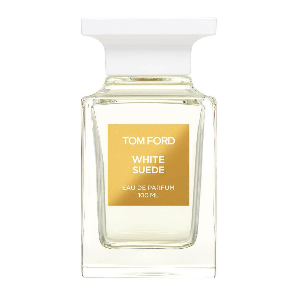 Tom Ford White Suede's top notes are Thyme and Tea; middle notes are Lily-of-the-Valley, Saffron, and Rose; base notes are Suede, Musk, Sandalwood, Olibanum, and Amber.
